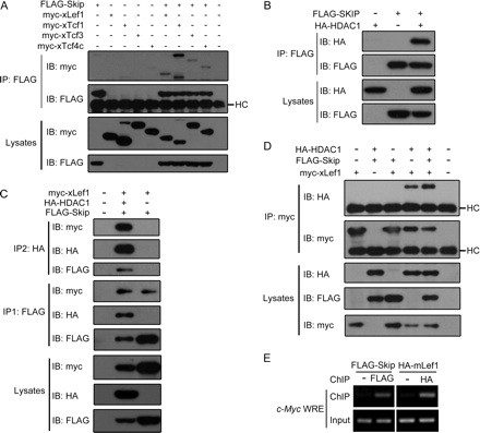 FIGURE 3. Skip forms a ternary complex with LEF1 and HDAC1. A, Skip interacts with TCF/LEF family members. HEK293T cells were transfected as indicated, and lysates were immunoprecipitated by FLAG-M2 beads. Total lysates and IP samples were analyzed by Western blot (IB, immunoblot). HC, heavy chain of immunoglobulin. B, Skip interacts with HDAC1. 293T cells were transfected as indicated, and IP was performed as in A. C, Skip, HDAC1, and LEF1 are in the same complex. 293T cells were transfected as indicated, and two-step IP was performed as described under xperimental Procedures.Equal amount of myc-xLef1 was recovered after the first-step IP (IP1); however, after the second-step IP (IP2), LEF1 was recovered only when all three proteins were co-transfected but not when HDAC1 was absent. D, Skip enhances the interaction between LEF1 and HDAC1. 293T cells were transfected as indicated, and IPs were performed with anti-Myc antibody. E, overexpressed Skip protein associates with the promoter of Wnt target gene. 293T cells were transfected as indicated, and ChIP was performed with the indicated antibodies followed by PCR with specific primers against WRE on the c-myc promoter. This research was originally published in The Journal of Biological Chemistry. Wang et al âXenopus skip modulates Wnt/beta-catenin signaling and functions in neural crest induction.â April 2, 2010; 285 (14):10890-10901. © The American Society for Biochemistry and Molecular Biology. Reproduced with permission. |