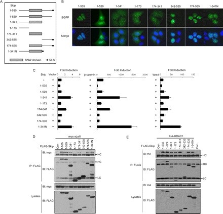 FIGURE 6. Domain analysis of Skip effect on Wnt signaling. A, schematic showing Skip deletions. B, cellular localization of Skip deletions. EGFP-tagged Skip and its deletions were transfected into HeLa cells. The nucleus was stained with 4,6-diamidino-2-phenylindole. C, Skip and its deletions affect Wnt signaling. The skip plasmids were co-transfected with vector, β-catenin, or Wnt as indicated, and a luciferase reporter assay was performed. D, the SNW domain likely mediates the interaction between Skip and LEF1. E, both the N-terminal and SNW domains are required for the interaction between Skip and HDAC1. Transfected 293T cells were lysed, immunoprecipitated by FLAG-M2 beads, and analyzed by Western blot (IB, immunoblot). HC, high chain of immunoglobulin; LC, light chain of immunoglobulin. This research was originally published in The Journal of Biological Chemistry. Wang et al âXenopus skip modulates Wnt/beta-catenin signaling and functions in neural crest induction.â April 2, 2010; 285 (14):10890-10901. © The American Society for Biochemistry and Molecular Biology. Reproduced with permission. |