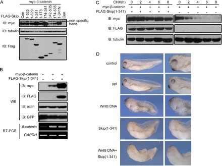 FIGURE 7. C-terminally truncated Skip enhances Wnt signaling. A, some of the Skip deletions cause β-catenin accumulation. Myc-β-catenin was co-transfected with Skip deletions in 293T cells, and cell lysates were analyzed by Western blot (IB, immunoblot). B, Skip-(141) promotes β-catenin accumulation without affecting its mRNA level or co-transfected GFP. Skip-(141), GFP, and β-catenin were transfected in 293T cells as indicated. Total cell suspension was divided into two parts; one was analyzed by Western blot (WB) and the other by RT-PCR. Actin and glyceraldehyde-3-phosphate dehydrogenase (GAPDH) were used as loading controls. C, β-catenin degradation is drastically blocked in the presence of Skip-(141). 100 μg/ml cycloheximide (CHX) was added 40 h after transfection; cells were then collected every 2 h, and the total lysates were analyzed by Western blot. D, Skip-(141) induces posteriorization of Xenopus embryos. 4-Cell-stage embryos were injected animally with 250 pg of skip-(141) mRNA and/or 10 pg of Wnt8 plasmid DNA in each blastomere as indicated. Tail bud-stage embryos were shown from a lateral view with the anterior side toward the left. A closer look at the head region is shown on the right. ppl, preprolactin was used as the injection control. |