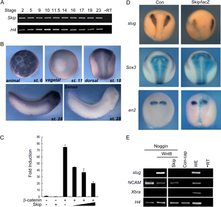 FIGURE 2. Skip inhibits neural crest development. A, Xenopus skip expression at the indicated development stages was analyzed by RT-PCR. âRT, minus reverse transcription. Histone H4 was used for normalization. B, expression profile of skip in Xenopus embryos was shown by whole mount in situ hybridization. st, stage. C, Skip inhibits β-catenin signaling in a dose-dependent manner in Xenopus embryos. 4-Cell-stage embryos were injected equatorially with 250 pg of β-catenin and/or 50, 250, or 500 pg of skip mRNA, together with a TOPflash reporter plasmid, in each blastomere as indicated. Embryos were gathered at stage 11.5 and analyzed by the Dual-Luciferase assay system. D, skip mRNA injection causes inhibition of slug expression. 2-Cell-stage embryos were injected in one blasteomere with control (Con) or skip mRNA (2 ng) and fixed at the early neurula stage for whole mount in situ hybridization analysis with slug, Sox3, and engrailed2 (en2) probes. lacZ mRNA (0.5 ng) was co-injected as a lineage tracer. Light blue, lacZ staining; dark blue and brown, hybridization signal. E, Skip blocks slug induction by Wnt signaling in Xenopus animal caps. 100 pg of noggin, 50 pg of wnt8, and 1 ng of skip mRNA were injected animally into each blastomere at the 4-cell-stage as indicated. At stage 8, animal caps were dissected, cultured until stage 14, and analyzed for expressions of slug, NCAM, Xbra, and H4 by RT-PCR. H4 was used as the loading control, and Xbra was used to confirm that the animal caps were without mesoderm contamination. âRT, minus reverse transcription; WE, whole embryo. This research was originally published in The Journal of Biological Chemistry. Wang et al âXenopus skip modulates Wnt/beta-catenin signaling and functions in neural crest induction.â April 2, 2010; 285 (14):10890-10901. © The American Society for Biochemistry and Molecular Biology. Reproduced with permission. |