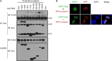 FIGURE 8. Skip colocalizes and weakly interacts with β-catenin. A, β-catenin is co-immunoprecipitated with Skip and its deletions. 293T cells was transfected as indicated, and total cell lysates were immunoprecipitated by anti-Myc antibody and analyzed by Western blot (IB, immunoblot). HC, heavy chain of immunoglobulin; LC, light chain of immunoglobulin, B, full-length Skip colocalizes with β-catenin in the nucleus. HeLa cells were co-transfected with EGFP-Skip and red fluorescent protein-β-catenin. The green color stands for Skip and red for β-catenin. The nucleus stained by 4,6-diamidino-2-phenylindole (DAPI) is shown in blue. This research was originally published in The Journal of Biological Chemistry. Wang et al âXenopus skip modulates Wnt/beta-catenin signaling and functions in neural crest induction.â April 2, 2010; 285 (14):10890-10901. © The American Society for Biochemistry and Molecular Biology. Reproduced with permission. |