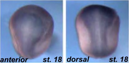 snw1 ( SNW domain containing 1 ) gene expression in Xenopus laevis embryos, NF stage 18, as assayed by in situ hybridization, anterior view and dorsal view, anterior up. This research was originally published in The Journal of Biological Chemistry. Wang et al enopus skip modulates Wnt/beta-catenin signaling and functions in neural crest induction.April 2, 2010; 285 (14):10890-10901. The American Society for Biochemistry and Molecular Biology. Reproduced with permission. |