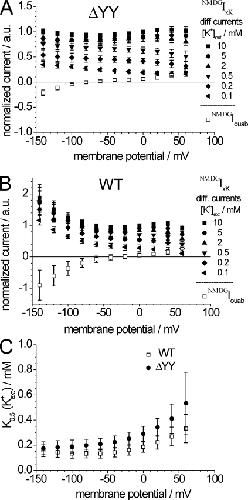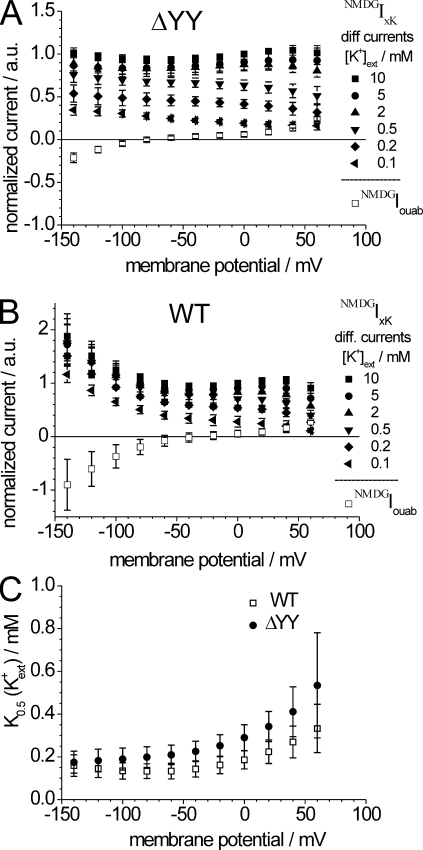 Figure 3. Voltage and [K+]ext dependence of stationary currents in the absence of Na+ext. (A and B) I-V curves of normalized K+-dependent NMDGIxK difference currents of the ΔYY construct (A) and ATP1A2 WT (B) in the absence of extracellular Na+ ([NMDG+]ext = 100 mM, pH 7.4) with [K+]ext as indicated. Also shown in A and B are the ouabain-sensitive currents (NMDGIouab) in the absence of K+ for the ΔYY construct and ATP1A2 WT. (C) K0.5(K+ext) values for the ΔYY construct and for ATP1A2 WT at [Na+]ext = 0. For each construct, data are means ± SD from eight oocytes out of two batches.