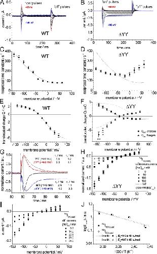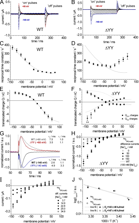 Figure 4. Properties of transient currents and hyperpolarization-induced inward currents of the ÎYY construct. (A and B) Ouabain-sensitive presteady-state currents NaI(ouab) at [Na+]ext = 100 mM and [K+]ext = 0, pHext 7.4, upon voltage steps from â30 mV to potentials between +60 and â140 mV (in 20-mV decrements) for WT (A) and the ÎYY construct (B). (C and D) Voltage dependence of reciprocal time constants from ON transient currents for ATP1A2 WT (C) and ÎYY (D). Data for WT and ÎYY are means ± SE from 14 cells out of three batches. Results from a fit of a polynomial function to the WT or ÎYY data are superimposed in C and D as a dashed or dotted line, respectively. (E) Q-V curves obtained from QOFF charges of transient currents from 14 cells expressing ATP1A2 WT. The corresponding QON charges were equivalent (not depicted). The fit of a Boltzmann function to Q-V distribution is superimposed as a dashed line (fit parameters: Qmin = â6.65 ± 0.12 nC; Qmax = 2.34 ± 0.04 nC; V0.5 = â0.5 ± 1.0 mV; zq = 0.76 ± 0.02). (F) Q-V curves obtained from QON and QOFF charges of 14 cells expressing the ÎYY construct. The fit of a Boltzmann function to the QOFF values is superimposed as a dashed line (fit parameters: Qmin = â1.14 ± 0.17 nC; Qmax = 4.72 ± 0.63 nC; V0.5 = â83.4 ± 7.9 mV; zq = 0.81 ± 0.06). The short dashed line represents the inverted QOFF fit curve for comparison with QON values. QON and QOFF values of the ÎYY construct were significantly different at hyperpolarizing potentials (*, P > 0.05; **, P > 0.005; Studentâs t test). The WT Q-V curve from E is included as a dotted line in F after appropriate scaling. (G) Transient currents in response to ON voltage steps to +60 and â140 mV from WT data in A and ÎYY data in B on an expanded time scale. The voltage step occurred at 58 ms (dashed line). Fits of the sum of two exponential functions to the data (from t0 = 59 ms) yielded time constants for the fast rise, Ï1, and the slower decay, Ï2. The peak of the transient current of ÎYY at â140 mV appeared with a delay of â¼2 ms (gray bars). (H) [Na+]ext dependence of normalized ouabain-sensitive inward currents of the ÎYY construct at [K+]ext = 0. The shallow dashed line shows the I-V curve of NaI(ouab) currents of ATP1A2 WT at [Na+]ext = 100 mM and [K+]ext = 0. For each construct, data are means ± SE from 14 cells of four batches. (I) [Na+]int dependence of ouabain-sensitive NaI(ouab) currents (at [Na+]ext = 100 mM and [K+]ext= 0), measured on an oocyte coexpressing the ÎYY construct and the amiloride-sensitive Na+ channel ENaC. Na+ loading was achieved by exposing oocytes to [Na+]ext-containing solutions in the absence of amiloride, and [Na+]int was determined after each loading step from the amiloride-sensitive reversal potential shift (see Materials and methods). Data from one out of three experiments with a similar [Na+]int range are shown. (J) Temperature dependence (Arrhenius plots) of Na+/K+ pump currents (NaI10K) at 0 mV (filled squares) and hyperpolarization-induced inward currents (NaI(ouab)) at â140 mV (open squares) of the ÎYY construct. Data are from one out of four experiments across a similar temperature range (18â30°C). For both data sets, the amplitudes were normalized to the respective current at 21°C. Activation energies were derived from linear fits to the data.