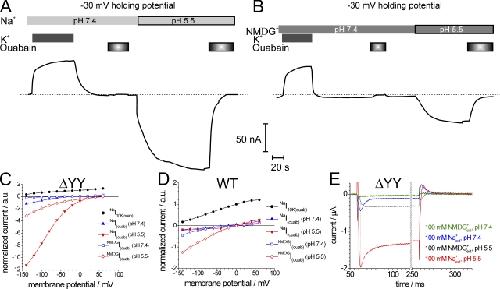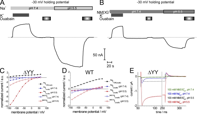 Figure 5. Voltage dependence of stationary and ouabain-sensitive transient currents of the ΔYY construct under different ionic conditions and pHext. (A and B) Current recordings at −30 mV from a ΔYY-expressing oocyte in the presence (A) or absence (B) of extracellular Na+ at pH 7.4 and 5.5. If present, [Na+]ext and [NMDG+]ext were 100 mM, and [K+]ext and [ouabain] were 10 mM. The composition of the extracellular solution is indicated above the current traces. Dashed lines indicate the “zero pump current” level (at 10 mM ouabain) as a reference for pump-related currents. (C and D) I-V curves of stationary currents in different extracellular solutions from oocytes expressing ΔYY (C) or ATP1A2 WT (D), each normalized to the NaI10K(ouab) current at 0 mV. Similar data were obtained on at least three different cells. (E) Ouabain-sensitive transient currents of ΔYY at pH 7.4 (NMDGI(ouab) and NaI(ouab)) and pH 5.5 (NMDGI(ouab)5.5 and NaI(ouab)5.5) in the absence of K+ext upon 250-ms voltage steps from −30 to −140 mV. The peak of the NaI(ouab) current is indicated by a dotted line. Note the time axis break (hatched bar).