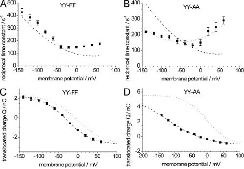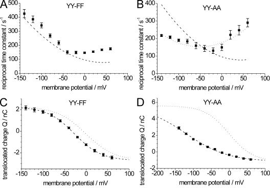 Figure 7. Properties of transient currents for mutants YY-FF and YY-AA. (A and B) Voltage dependence of reciprocal time constants from ON transient currents for mutant YY-FF (A) and YY-AA (B) ([Na+]ext = 100 mM and [K+]ext = 0, pH 7.4). Data are means ± SE from 13 (YY-FF) or 10 (YY-AA) oocytes from at least three batches. Curves delineating the corresponding WT data from Fig. 4 C (dashed lines in A and B) and the ÎYY data from Fig. 4 D (dotted line in B) are superimposed. (C and D) Q-V curves for QOFF charge integrals from oocytes expressing ATP1A2 mutants YY-FF (C) and YY-AA (D). Dashed lines show fits of a Boltzmann function with the following parameters: YY-FF (C): Qmin = â2.73 ± 0.05 nC; Qmax = 2.26 ± 0.03 nC; V0.5 = â27.1 ± 0.8 mV; zq = 0.81 ± 0.02; YY-AA (D): Qmin = â1.15 ± 0.13 nC; Qmax = 5.59 ± 0.15 nC; V0.5 = â120 ± 18 mV; zq = 0.44 ± 0.03. The Q-V distribution of ATP1A2 WT from Fig. 4 E is superimposed as a dotted line in C and D after appropriate scaling.