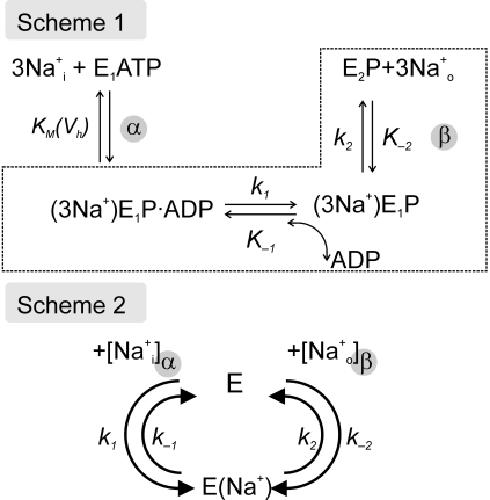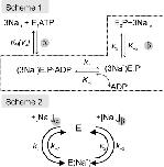Figure 8. Partial reaction schemes for the Na+ transport limb of the Na+/K+-ATPase cycle. Scheme 1 was introduced by Holmgren and Rakowski (2006) to describe the dependence of Na+/K+-ATPase presteady-state currents on intracellular [Na+]. At saturating intracellular concentrations of Na+ and ATP, the intracellular Na+ binding (and phosphorylation) is at rapid equilibrium, and the subsequent slow occlusion step kinetically isolates the intracellular Na+ binding step from the more rapid extracellular Na+ release steps. Scheme 2 refers to Vasilyev et al. (2004), who provided a concept for the mainly H+-driven inward currents of the Na+/K+-ATPase observed in Na+- and K+-free extracellular solutions. At low pHext, the energy barrier for equilibration of occluded Na+ ions with the intracellular space is reduced so that the occluded state can be reached from the extracellular as well as the intracellular solution. See Appendix for details.