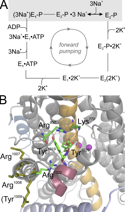 Figure 1. Reaction scheme and structural detail of the Na+/K+-ATPase. (A) Modified Post-Albers reaction cycle of the Na+/K+-ATPase. Upon intracellular binding of Na+ ions to the E1 conformation, a phosphointermediate with occluded Na+ ions, E1P(3Na+), is formed, and after a conformational change to E2P(3Na+), the Na+ ions dissociate to the extracellular space. Subsequently, two K+ ions bind from the extracellular side and become occluded, a process that stimulates dephosphorylation, and after a conformational change from E2 to E1, the K+ ions are intracellularly released. The gray box indicates the reaction sequence that can be studied by voltage pulses at high [Na+]ext and [K+]ext = 0 in TEVC experiments. (B) Structure of the Na+/K+-ATPase according to PDB structure entry 3B8E (Morth et al., 2007). Amino acids referred to in this work are indicated in ball-and-stick representation with numbering according to the human Na+/K+-ATPase α2 subunit. Helix M5 is depicted in yellow, the backbone of the carboxy terminus (V1014-EKETY-Y1020) is in red, and residues of a carboxy-terminal arginine cluster are in olive. Two Rb+ ions at the binding sites are shown as magenta spheres. Note that Arg1005 in the 3B8E structure (pig renal α1 subunit) corresponds to Tyr1009 in the human Na+/K+-ATPase α2 subunit.