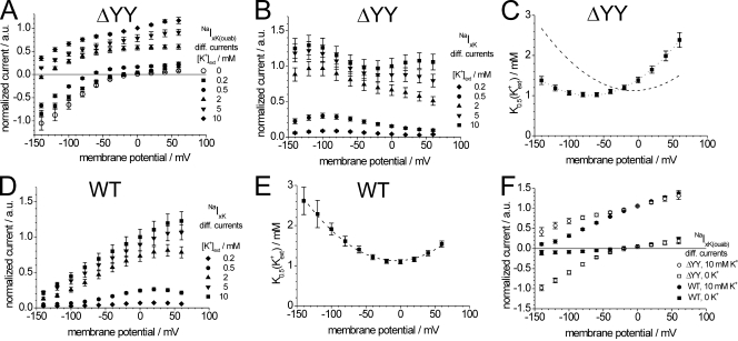 Figure 2. Voltage and [K+]ext dependence of stationary currents at [Na+]ext = 100 mM. (A) I-V curves of normalized ouabain-sensitive K+-dependent currents NaIxK(ouab) of the Na+/K+-ATPase ÎYY deletion construct measured at 100 mM [Na+]ext and [K+]ext as indicated. (B) I-V curves of normalized K+-induced difference currents NaIxK (at 100 mM [Na+]ext) of the ÎYY construct. (C) Voltage-dependent NaK0.5(K+ext) values of the ÎYY construct from fits of a Hill function to the NaIxK currents in B at each membrane potential. The minimal NaK0.5(K+ext) was 1.02 ± 0.06 mM at â80 mV. The dashed line delineates the corresponding WT data from E for comparison. (D) I-V curves of normalized NaIxK difference currents for ATP1A2 WT with [K+]ext as indicated. (E) Voltage-dependent NaK0.5(K+ext) values for ATP1A2 WT from fits of a Hill function to the NaIxK currents in D at each membrane potential. The minimal NaK0.5(K+ext) was 1.10 ± 0.05 mM at 0 mV. Data for both WT and ÎYY are means ± SE from 14 cells of three oocyte batches. (F) I-V curves of normalized NaI10K(ouab) and NaI0K(ouab) currents of ATP1A2 WT and the ÎYY construct at pHext 7.4 ([Na+]ext = 100 mM). Data are means ± SE from six (WT) and seven (ÎYY) cells from two batches.