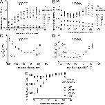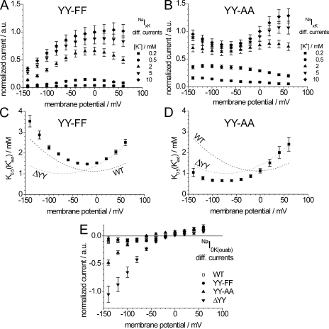 Figure 6. Properties of stationary currents of ATP1A2 mutants YY-FF and YY-AA. (A and B) Normalized I-V curves for NaIxK currents of ATP1A2 mutants YY-FF (A) and YY-AA (B), with [K+]ext as indicated ([Na+]ext = 100 mM, pH 7.4). (C and D) NaK0.5(K+ext) values from NaIxK currents for mutant YY-FF (C) and YY-AA (D) from fits of a Hill function to the data in A and B at each membrane potential. The corresponding WT data from Fig. 2 E (dashed lines in C and D) and ÎYY data from Fig. 2 C (dotted lines in C and D) are superimposed. (E) I-V curves of normalized ouabain-sensitive NaI(ouab) currents ([Na+]ext = 100 mM and [K+]ext = 0, pH 7.4) for ATP1A2 WT and mutants YY-FF, YY-AA, and ÎYY. Data are means ± SE of 10â14 cells from three batches.