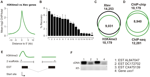 Figure 3. Analyses of H3K4me3 triplicate.(A) Distributions of H3K4me3 at annotated Xtev genes. (B) ChIP-qPCR validation of randomly selected enriched H3K4me3 regions on three new generated biological replicates. 16 out of 17 of H3K4me3 enriched regions are validated as true positives with an average enrichment >2.5-fold over background (genomic locus on scaffold_1:6458583-6458633). Asterisk indicates a locus with <2.5-fold enrichment (experimental FDR <0.06). Error bars represent the SEM of three independent ChIP experiments. (C) Overlap of H3K4me3-enriched regions and Xtev genes (p<10−25). (D) Overlap of H3K4me3 ChIP-chip and ChIP-seq peaks. Of the peaks found with ChIP-chip, 88% are also detected with ChIP-seq [9] (p<10−25). (E) ‘Orphan’ H3K4me3 peaks linking different scaffolds. Schematic overview of orphan linkage of two scaffolds using H3K4me3 signals and the EST database. The start site is determined by the H3K4me3 peak and the transcription unit combined with the EST information of the other scaffold. (F) RT-PCR validation of ESTs linking two scaffolds using primers that align to two different scaffolds: scaffold 649 and 145 (EST AL847047), scaffold 675 and 1278 (EST DC172702), scaffold 716 and 1312 (EST CX475139) and scaffold 1393 and 307 (uxs1). cDNA used for validation was generated from RNA isolated from stage 11–12 embryos.