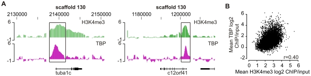 Figure 4. TBP-enrichment at loci of promoter microarray design.(A) Independent genes visualized in the UCSC Genome Browser for H3K4me3 (green) and TBP (pink). Left panel represents tubulin, alpha 1c (tuba1c) and the right panel human chromosome 12 open reading frame 41 (c12orf41). (B) Correlation of H3K4me3 ChIP-chip and TBP promoter ChIP-chip. Spearman rank r = 0.40 (p<2.2 * 10−16).