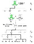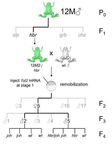 Figure 6. Family tree of the 12M founder line with remobilization of progeny from F1 frog 12M2. Schematic representation of the outcross and remobilization strategy used to characterize the 12M family. The founder (P0) 12M frog was outcrossed to yield the four independently-segregating alleles slp, hbr, grb and chs. An F1 frog that had a single hbr allele (12M2♀) was used to generate one-cell embryos for the Tol2 injection-mediated remobilization experiment. Outcross of remobilized F2 frog 12M2♀5 resulted in the generation of four new Tol2XIG transposon alleles. Serial outcross of the progeny of 12M2♀5 indicated that, in the absence of injected Tol2 transposase, the remobilized Tol2 transposons are stable in the Xenopus tropicalis genome and are transmitted to the progeny at the expected Mendelian frequencies. |