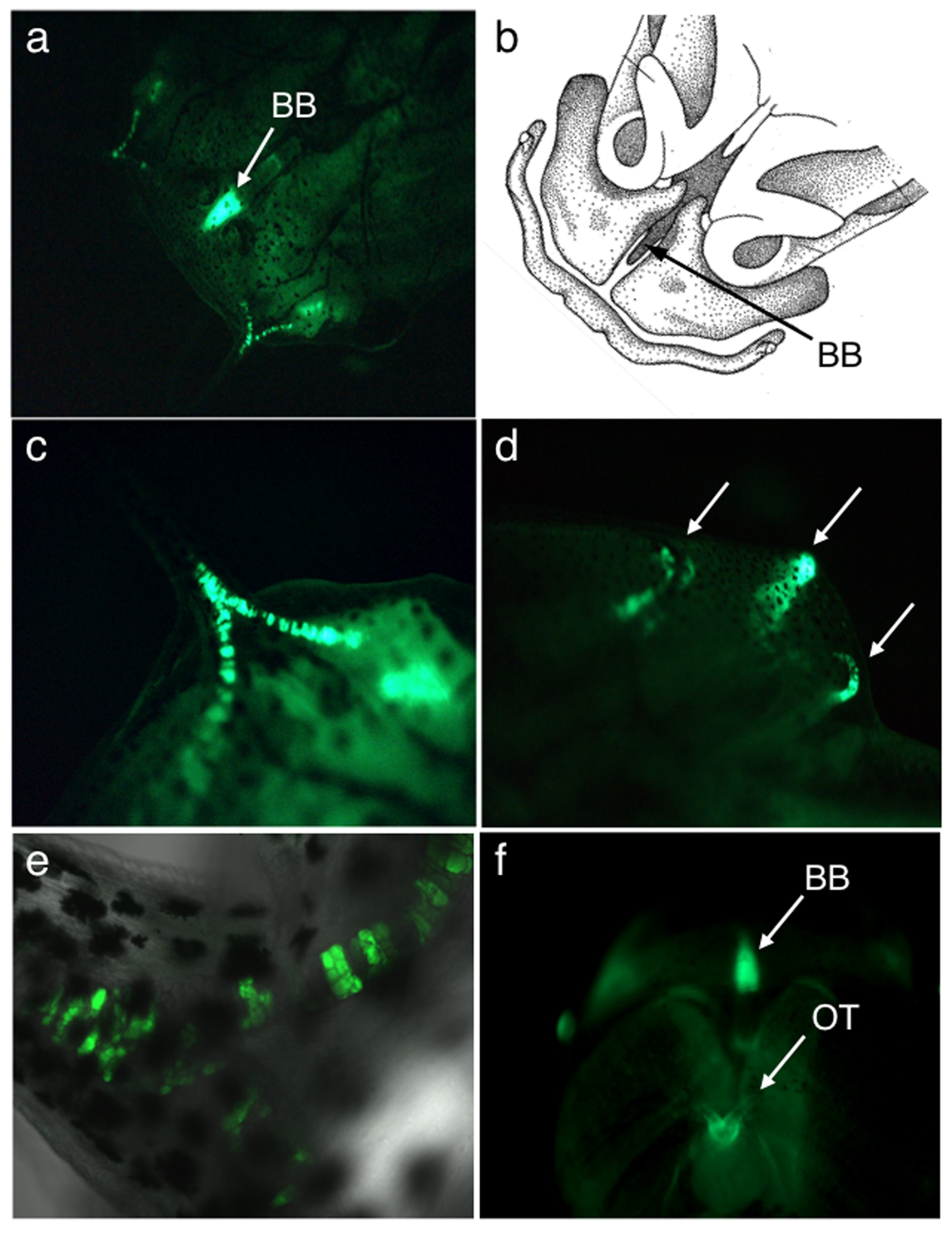 Additional file 3. Supplemental Figure S2 - GFP expression in the Soul Patch line. GFP expression profile of the Soul Patch (slp) line derived from the Tol2XIG 12M founder. The EF-1α promoter in the Tol2XIG construct can be influenced by local regulatory elements near the transposon insertion site to override the normal ubiquitous expression of the GFP reporter. The slp allele has intense GFP expression in various cartilages in the developing tadpole (Stage 51 shown). (a) slp results in intense GFP expression in the provisionally identified basihyal basibranchial (BB) cartilage at the midline of the head. (b) Schematic representation of the tadpole head skeleton indicating the relative position of the basihyal basibranchial cartilage (adapted from Weisz, 1945 [59]). The slp allele also results in intense GFP expression in the cartilage supporting the tentacle (c and e) and the cartilage supporting the gill arches (d, white arrows). GFP expression is clearly visible in the outflow tract (OT) of the heart in slp tadpoles (f). Images a, c, d and f were taken on a fluorescent dissecting microscope and e is an |