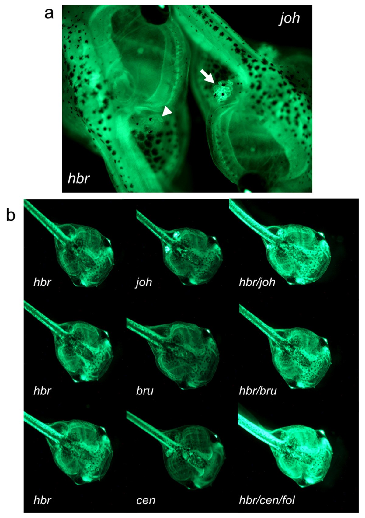 Figure 3. Remobilized Tol2 transposons are transmitted through the germline and result in novel GFP expression patterns. Fluorescent photomicrographs of sibling GFP-positive tadpoles from the outcross of remobilized frog 12M2♀5. (a) The parental integration pattern (hbr) is shown in the tadpole on the left (anterior facing upper left) and the novel GFP expression pattern is shown on the right (jovan heat, joh; anterior facing lower right). The tadpoles were oriented to juxtapose the kidneys for comparison of the different levels of GFP expression in the kidneys of the two lines. Note the intense GFP expression in the kidney of the joh tadpole (white arrow) compared to the kidney of the hbr tadpole (white arrowhead). (b) Representative GFP expression patterns from the outcross of 12M2♀5. Left column shows tadpoles (stage 48) with the parental (hbr) GFP expression pattern. Four novel transposon insertion sites were identified in the progeny of 12M2♀5 and were named jovan heat (joh), brut (bru), centaure (cen) and follique (fol). Each of the novel integration events has a subtle difference in the resulting GFP expression pattern. All tadpoles are oriented with the anterior facing towards the lower right corner of each panel. |