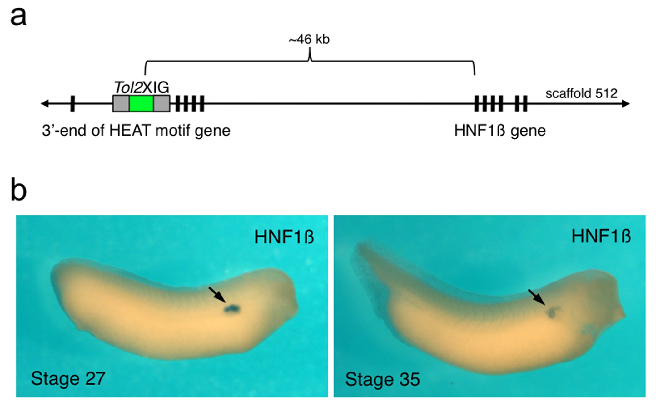 Additional file 4. The jovan heat (joh) allele has a Tol2XIG transposon integrated near the HNF1β gene (a) Schematic representation of the Tol2XIG integration event in joh (not to scale). The transposition reaction resulted in integration of the transposon in intron 9 of a novel HEAT motif-containing gene on scaffold 512:565147. In situ hybridization with antisense RNA probes generated to the HEAT repeat cDNA indicated low-level ubiquitous expression of the HEAT motif-containing gene that lacked robust expression in the developing kidney (data not shown). The HNF1β gene flanks the 3' end of the HEAT motif-containing gene and is approximately 46 kb from the Tol2XIG transposon. (b) In situ hybridization for HNF1β expression during Xenopus development shows intense staining in the developing kidney [47]. Antisense RNA probes were synthesized from a Xenopus laevis HNF1β cDNA (IMAGE 4959359). In situ stained albino Xenopus laevis embryos shown at stages 27 and 35 (anterior is facing to the right, dorsal up). Arrows point to the developing kidney. |