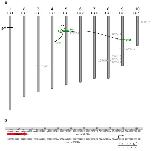 Figure 5. Chromosome map of Tol2 transposon insertions transmitted through the germline. (a) Schematic representation of Xenopus tropicalis chromosomes and the relative location of the Tol2 integration sites (not to scale). Chromosomal assignments were predicted using the scaffold identity revealed by comparison of the transposon flanking sequence with the Xenopus tropicalis genome sequence (JGI v4.1 assembly). The position of the Tol2 integration on each chromosome was estimated from the map position of the corresponding scaffold. The parental integration site, hbr used for the germline remobilization experiment, is depicted by the thick green line and is labeled on the left side of the chromosome. Examples of remobilized transposition events that are passed through the germline are in green and are labeled on the right hand side of the corresponding chromosome. Mapping the integration sites provided evidence for both 'local hopping' and random re-integration throughout the genome. Remobilization events are indicated by the arrows. (b) Sequence analysis of the EPTS LM-PCR product from the fol allele reveals integration of the Tol2XIG transposon at the beginning of the first exon of the MTHFD1L gene. The sequence of the 5'-end of Tol2XIG is in lowercase italics and represented by the red arrow. The integration event has occurred at the first nucleotide of exon 1 (uppercase text) of the MTHFD1L gene, 169 bp upstream of the translation start codon, depicted by the dark arrow above the sequence. The first five amino acids of the MTHFD1L gene are shown in single letter code below the corresponding codons. |