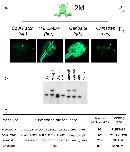 Additional file 2. Supplemental Figure S1 - The 12M founder has four independently-segregating Tol2XIG transposons each with a unique GFP expression pattern. Outcross of the 12M founder resulted in the segregation of four independent Tol2XIG alleles and revealed unique GFP expression patterns associated with each integration event. (a) Schematic representation of the outcross of founder 12M to yield tadpoles with individual expression patterns. The individual patterns were named Soul Patch (slp), Handlebar (hbr), Garibaldi (grb) and Chinstrap (chs). Tadpoles were photographed at stage 51 and the figures are oriented with anterior towards the top of the panel. The intense GFP expression in the slp embryo in the basihyal basibranchial cartilage is labelled BB. The bright GFP expression in the leading edge of the hbr tadpole is indicated by the white arrow. The white arrowhead in the chs panel points to the GFP expression in the lower jaw of the tadpole. The eye is labelled in this panel to guide the reader. (b) Southern blot analysis of F1 tadpoles harbouring different combinations of the four transposons in founder 12M. Genomic DNA from individual tadpoles was digested with BglII and the resulting Southern blot was probed with a GFP probe. (c) EPTS LM-PCR was used to clone the genomic sequences flanking the transposon insertion sites in three of the four 12M alleles. The genomic DNA sequence flanking the transposon is indicated by the capitalized text and the sequence of the 5' end of Tol2XIG is shown in lowercase italics. |