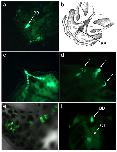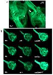 Representative GFP expression patterns from NF stage 48 tadpole with novel transposon insertion sites called centaure (cen). tadpole in dorsal view, with anterior facing towards the lower right corner. |