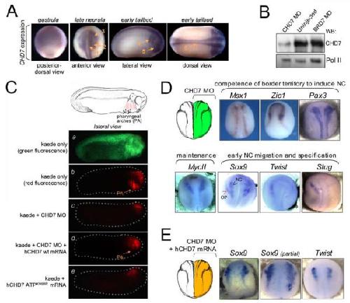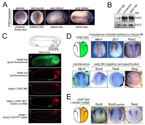 Figure 2. CHD7 and its ATP-ase function are required for neural crest migration in vivo. (A) CHD7 mRNA expression during Xenopus embryogenesis. CHD7 expression was visualized by RNA in situ hybridization at indicated stages of development, showing diffuse pattern at the gastrula stage, but expression localized to the neural (arrow 1), neural crest (arrow 2) and preplacodal ectodermal (arrow 3) tissues at the late neurula stage. At the tailbud stages, CHD7 is expressed in the pharyngeal arches (arrow 4) and optic placode (arrow 5), as well as alongside the neural tube (arrow 6).