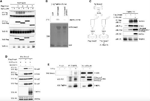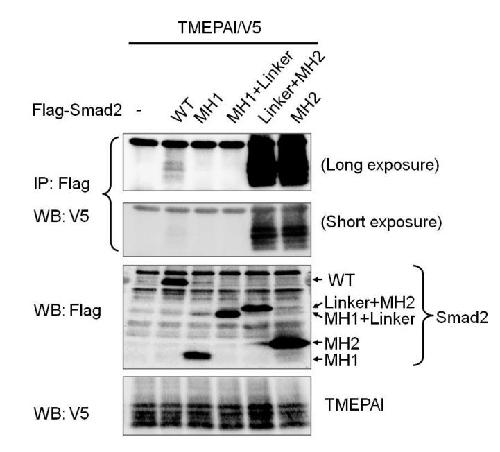 Figure S9. Interaction of TMEPAI with Smad2 COS7 cells were transfected with indicated plasmids and harvested for Co-IP experiments. Since Smad2 mutants lacking the MH1 domain interacted with TMEPAI more strongly than wild-type Smad2, two panels for short and long exposures are shown as results of co-IP. |