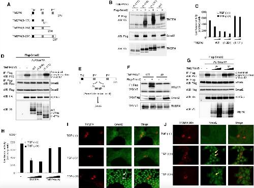 Figure 3. Determination of Functional Domain in TMEPAI (A) Schematic presentation of deletion mutants for mouse TMEPAI. TM, transmembrane domain; PY, PY motif. (B) Interaction of TMEPAI mutants with Smad2. COS7 cells were transfected with indicated plasmids and harvested for coIP experiments. (C) Effect of TMEPAI mutants on TGF-β-induced reporter activity. Different doses of TMEPAI or its mutants were cotransfected with (CAGA)12-luc in HepG2 cells with or without 5 ng/ml TGF-β for 18 hr. (D) Effect of TMEPAI mutants on ALK5ca-induced Smad2 phosphorylation. Experiments were performed according to Figure 1B. (E) Schematic presentation of TMEPAI(4A) mutant. (F) Interaction of TMEPAI(4A) mutant with Smad2. COS7 cells were transfected with indicated plasmids and harvested for coIP experiments. (G) Effect of TMEPAI(4A) mutant on ALK5ca-induced Smad2 phosphorylation. Experiments were performed according to Figure 1B. (H) TMEPAI(4A) does not inhibit TGF-β-induced reporter activity. Experiments were performed according to Figure 3C. (I and J) TMEPAI, but not TMEPAI(4A), blocks nuclear translocation of Smad2 upon TGF-β stimulation. NMuMG cells were transfected with (I) TMEPAI or (J) TMEPAI(4A), stimulated with 5 ng/ml TGF-β for 1 hr, and fixed for immunofluorescence. Ectopic TMEPAI and endogenous Smad2 were visualized with red and green, respectively. White arrows indicate TMEPAI-expressing cells in which Smad2 did not translocate into the nucleus upon TGF-β stimulation. Yellow arrows indicate TMEPAI(4A)-expressing cells in which Smad2 could translocate into the nucleus upon TGF-β stimulation. |