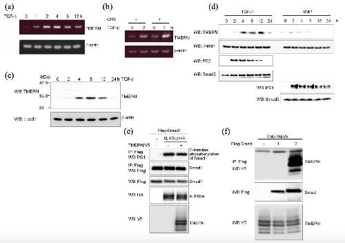 Figure S1. TMEPAI Inhibits TGF-β, but Not BMP, Signalings (a) Induction of TMEPAI mRNA by TGF-β. AML cells were treated with 5 ng/ml TGF-β for indicated times. Then, RT-PCR was performed using two specific mouse TMEPAI primers (5â-GTGATGATGGTGATGGTGGT-3â and 5â-ATCAGACAGTGAGATGGTGG-3â) and total RNAs. (b) De novo protein synthesis is not required for induction of the TMEPAI transcript by TGF-β. AML cells were stimulated with 5 ng/ml TGF-β 2 h after pretreatment with 5 ng/ml CHX for 1 h. RT-PCR was carried out as described in Supplementary Fig. 1a. (c) Expression of TMEPAI protein after treatment with TGF-β. NMuMG cells were treated with 5 ng/ml TGF-β for indicated times and then analyzed by western blotting with anti-TMEPAI polyclonal antibody. (d) TMEPAI protein is not induced by BMP-6 in C2C12 cells. C2C12 cells were stimulated with either 5 ng/ml TGF-β or 25 ng/ml BMP-6 for indicated times and then analyzed by western blotting with anti-TMEPAI polyclonal antibody, PS2 or anti-phospho-Smad1/5 antibody (PS1/5). (e) Effect of TMEPAI on Smad1 phosphorylation by BMP type I receptor. COS7 cells were transfected with indicated plasmids. To show phosphorylation of Smad1 upon ALK6 activation, the cell lysates were immunoprecipitated with anti-Flag M5 antibody, and then analyzed by western blotting with PS1/5. (f) Lack of interaction of TMEPAI with Smad1. COS7 cells were transfected with indicated plasmids and harvested for Co-IP experiments. Smad2 was used as a positive control. |