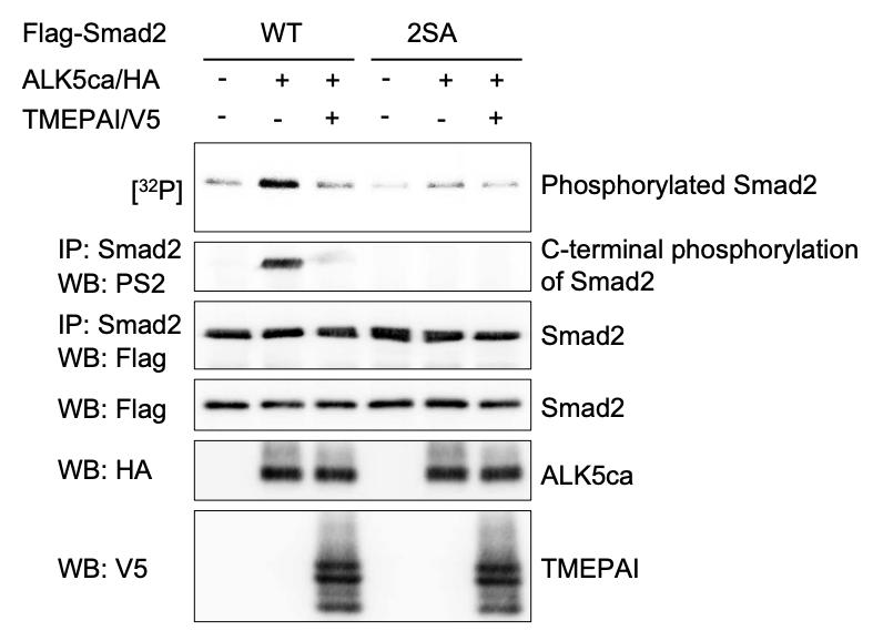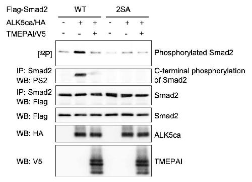 Figure S2. TMEPAI Blocks C-Terminal Phosphorylation of Smad2 upon ALK5 Activation COS7 cells were transfected with indicated plasmids and cultured for 40 h. To show phosphorylation of Smad2 upon ALK5 activation, [32P]orthophosphate was added to the medium 2 h before lysis. The cell lysates were immunoprecipitated with anti-Smad2 monoclonal antibody (BD Transduction). Simultaneously, C-terminal phosphorylation of Smad2 was detected with PS2. |
