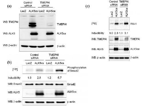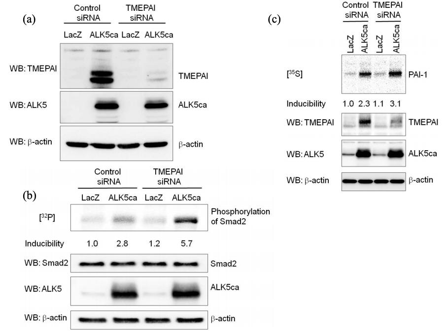Figure S5. Specific Knockdown of TMEPAI Enhances TGF-β-Induced Smad2 Phosphorylation and PAI-1 Expression (a) Specific TMEPAI knockdown in NIH3T3 cells. The cells were first transfected with TMEPAI-specific siRNA mixture purchased from Dharmacon according to the attached instruction manual and then infected with ALK5ca/HA or LacZ adenoviruses. After 12 h of infection, cell lysates were prepared for western blotting. (b) Phosphorylation of Smad2 upon ALK5 activation is potentiated by treatment of NIH3T3 cells with TMEPAI-specific siRNAs. NIH3T3 cells were transfected with siRNAs for 24 h, and then infected with adenoviral ALK5ca. Two hours before lysis, [32P]orthophosphate was added to the medium. The phosphorylation of Smad2 was normalized using the intensity of the band corresponding to Smad2. Inducibility was calculated relative to the value for LacZ-infected cells treated with control siRNA. (c) Specific knockdown of TMEPAI using siRNA-mediated approach enhances PAI-1 production. NMuMG cells were transfected with siRNAs for 24 h and then infected with adenoviral ALK5ca. Three hours before lysis of cells, Tran[35S]-Label was added to the medium. Subsequently, 35S-labeled PAI-1 produced by the cells was prepared as described in Fig. 1e. PAI-1 production was normalized using the intensity of the band corresponding to β-actin. Inducibility was calculated relative to the value for control siRNA-treated cells in the absence of ALK5ca. |