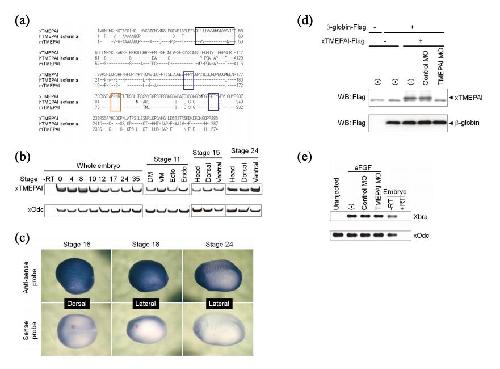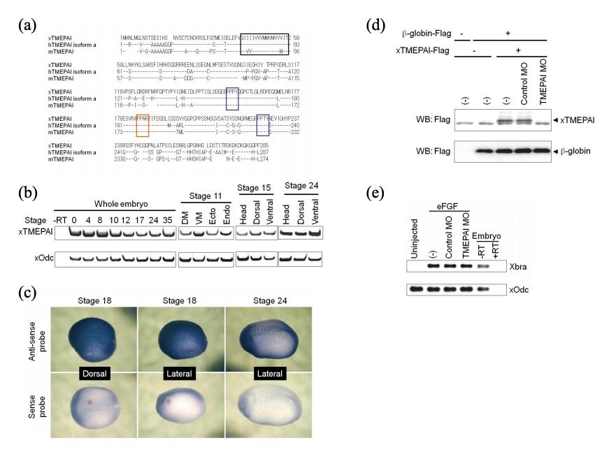 Figure S10. Effect of xTMEPAI on Activin Signaling in Xenopus laevis (a) Comparison of amino acid sequences of TMEPAI among Xenopus laevis, human and mouse. Identical amino acids between Xenopus laevis and human isoform a, or between Xenopus laevis and mouse show (-). Transmembrane domain, PY motifs and SIM domains are in black, blue and red boxes, respectively. The genebank accession numbers for Xenopus laevis TMEPAI are AB365488 and AB477425. (b) Developmental expression of TMEPAI in Xenopus embryos. Semi-quantitative RT-PCR analysis was performed to evaluate the expression of TMEPAI transcript at the indicated developmental stages. Total RNAs were isolated from whole embryos, and the dissected regions of dorsal mesoderm (DM), ventral mesoderm (VM), ectoderm (Ecto) and endoderm (Endo) of the bodies of stage 11, and head, dorsal and ventral regions dissected from the bodies of stages 15 and 24. The TMEPAI mRNA is stored maternally and present throughout development. TMEPAI is expressed ubiquitously at stages 11, 15 and 24. Xenopus embryonic ornithine decarboxylase (xOdc) was used as a control. No signal was detected in the absence of reverse transcriptase (-RT). (c) Whole-mount in situ hybridization analysis of TMEPAI at the indicated stages. The sense RNA probe for TMEPAI was used as a negative control. Images are dorsal and lateral views with the anterior ends toward the right. The TMEPAI transcript is present in whole area of Xenopus embryo at stage 18 (neurula) and stage 24 (early tailbud). (d) xTMEPAI MO specifically inhibited the translation of xTMEPAI mRNA. xTMEPAI mRNAs and TMEPAI MO were injected into the animal blastomeres of Xenopus embryos at two-cell stage. Animal cap explants were removed at the late blastula stage and were subjected to the analysis of western blotting. Flag tagged β-globin mRNA was used as a loading control. Control MO was used as a negative control. (e) TMEPAI MO has no effect on FGF-mediated mesoderm induction in animal cap explants. eFGF mRNA (100 pg/embryo), control MO (20 ng/embryo), and TMEPAI MO (20 ng/embryo) were injected into the animal poles of two-cell embryos as indicated. Animal caps were cultured until stage 11, and total RNA was prepared. Expression of Xbra and xOdc (ubiquitous control) was analyzed by RT-PCR. +RT and âRT indicate reverse transcriptional reaction using normal embryos with and without reverse transcriptase, respectively. |