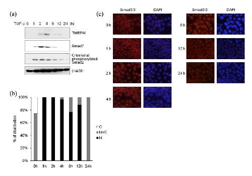 Figure S11. Induction of TMEPAI, Smad7, and Phosphorylated Smad2 upon TGF-β Stimulation HaCaT cells were stimulated with 0.5 ng/ml TGF-β for indicated times. (a) Expression of TMEPAI, Smad7, phosphorylated Smad2 and β-actin using mouse anti-TMEPAI, goat anti-Smad6/7 (SantaCruz), rabbit anti-phosphorylated Smad2 (PS2) and mouse anti-β-actin antibodies. (b) Nuclear translocation of Smad2 and Smad3 after TGF-β stimulation. Mouse anti-Smad2/3 monoclonal antibody (BD Transduction laboratories) was used for immunofluorescence. Nuclei were stained with DAPI. (c) Quantification of nuclear versus cytoplasmic staining for Smad2 and Smad3 upon TGF-β stimulation. C; cytoplasmic localization, C+N; both localization, N; nuclear localization. |