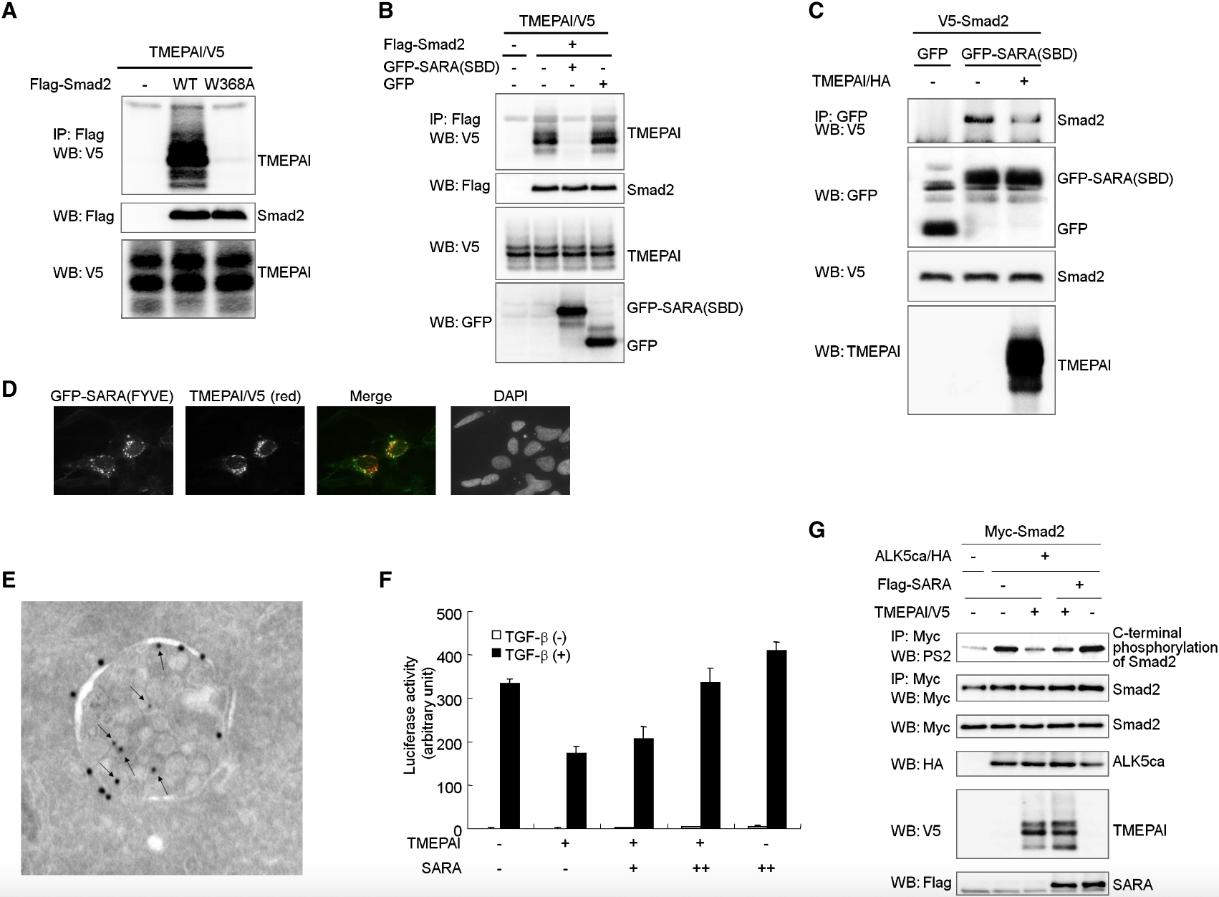 Figure 4. TMEPAI Colocalizes with SARA in Endosomes and Competes with SARA for Binding to Smad2 (A) Substitution of Trp368 to Ala in Smad2 abrogates the ability of Smad2 to interact with TMEPAI. COS7 cells were transfected with indicated plasmids and harvested for coIP experiments. (B and C) SARA(SBD) and TMEPAI prevent interaction of Smad2 with (B) TMEPAI and (C) SARA(SBD), respectively. Each cell lysate was mixed and subjected to coIP experiments according to Figure 2C. (D) GFP-SARA(FYVE) and TMEPAI/V5 were cotransfected in 911 cells. At 24 hr after transfection, cells were fixed and stained with mouse anti-V5 monoclonal antibody. Then, TexRed-conjugated goat anti-mouse IgG antibody (Molecular Probe) was used for visualization. (E) Electron microscopy of endosome-like structure containing GFP-FYVE and TMEPAI/V5. MCF10A1 cells were transfected with GFP-FYVE and TMEPAI/V5. After the fixation of cells, immunostaining was performed with (small dots) mouse monoclonal anti-V5 antibody (10 nm gold) and (large dots) rabbit polyclonal anti-GFP antibody (15 nm gold). Arrows point to TMEPAI-linked 10 nm gold particles. (F) SARA rescues TGF-β-induced transcription perturbed by TMEPAI. TMEPAI and (CAGA)12-luc were cotransfected with different doses of SARA in HepG2 cells with or without 5 ng/ml TGF-β for 18 hr. (G) Recuperative effect of SARA on ALK5ca-induced Smad2 phosphorylation blocked by TMEPAI. Experiments were performed according to Figure 1B. |