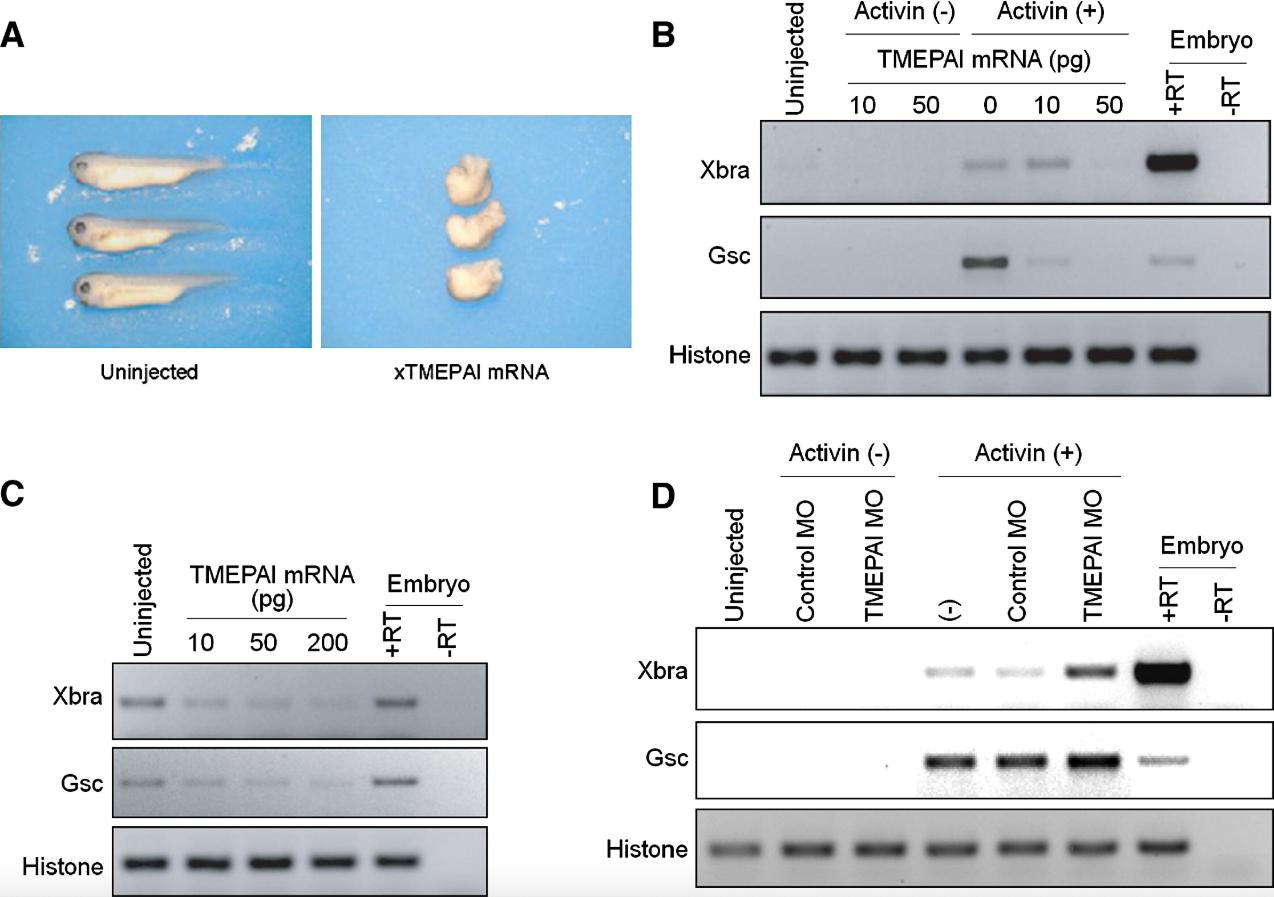 Figure 5. TMEPAI Blocks Activin Signaling in Xenopus Embryos (A) Ectopic expression of xTMEPAI in dorsal cells. mRNA coding for xTMEPAI (50 pg) was injected into two dorsal blastomeres at the four-cell stage. Phenotypes of embryos were determined at the tadpole stage (the typical examples are shown). (B) Inhibitory effect of xTMEPAI on expression of mesoderm markers in animal caps stimulated with activin. xTMEPAI mRNA was injected alone or together with activin mRNA (2 pg) near the animal pole of two-cell embryos, and animal caps were explanted at the blastula stage. Total RNAs were prepared and analyzed by RT-PCR. Histone was used as an internal control. +RT and âRT indicate reverse transcriptional reaction using normal embryos with and without reverse transcriptase, respectively. (C) RT-PCR analysis of the DMZ expressing xTMEPAI. xTMEPAI mRNA was injected into the DMZ at the four-cell stage. Subsequently, RNAs were prepared from embryos at stage 11. +RT and âRT indicate reverse transcriptional reaction using normal embryos with or without reverse transcriptase. (D) Knockdown of xTMEPAI enhances expression of mesoderm markers in animal caps stimulated with activin. TMEPAI MO and control MO were injected alone or together with activin mRNA (3 pg) near the animal pole of two-cell embryos, and animal caps were explanted at the blastula stage. All other experiments were performed according to Figure 5B. |