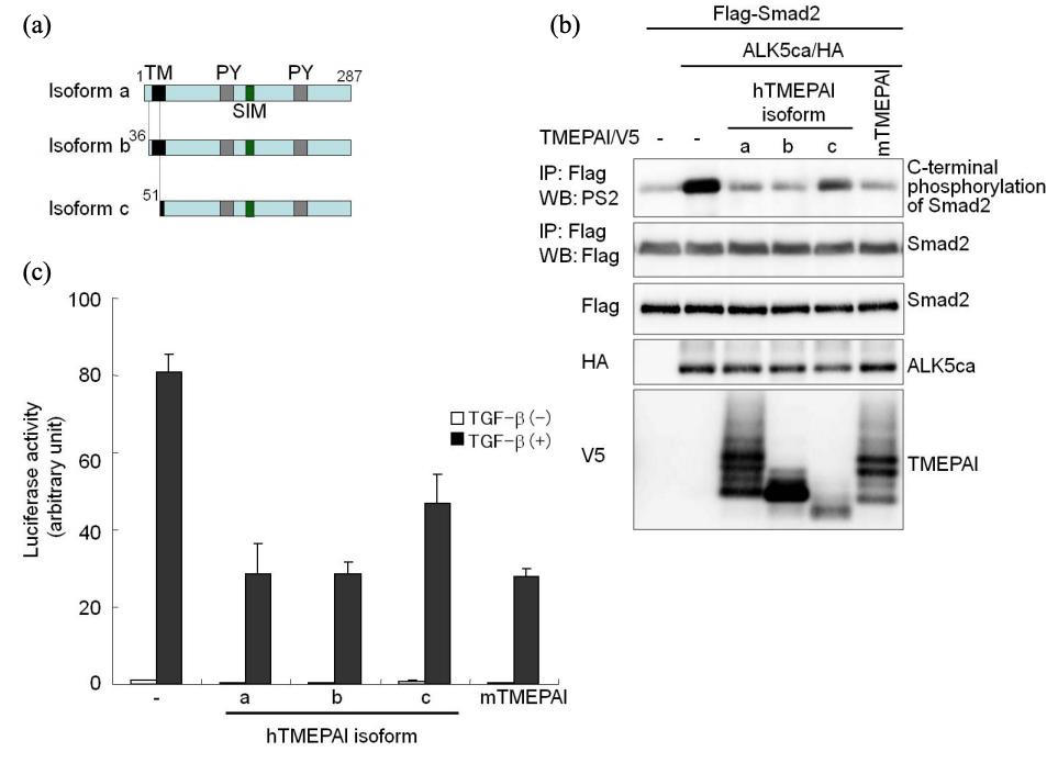 Figure S3. Three Isoforms for Human TMEPAI Show Inhibitory Effect on TGF-β Signaling (a) Schematic structures of three isoforms for human TMEPAI. Isoform b lacks a part of extracellular domain, whereas isoform c does not contain the half of TM. TM; transmembrane domain, PY; PY motif. (b) Inhibition of ALK5ca-induced Smad2 phosphorylation by human TMEPAI isoforms. COS7 cells were transfected with indicated plasmids. To show phosphorylation of Smad2 upon ALK5 activation, the cell lysates were immunoprecipitated with anti-Flag M5 antibody, and then analyzed by western blotting with PS2. TMEPAI isoforms including the extracellular domain shows multiple bands because of glycosylation. (c) Effect of human TMEPAIs on (CAGA)12-luc activity upon TGF-β stimulation in Mv1Lu cells. Human TMEPAI (hTMEPAI) isoforms were co-transfected with (CAGA)12-luc in Mv1Lu cells with or without 5 ng/ml TGF-β for 18 h. Mouse TMEPAI is termed mTMEPAI. |