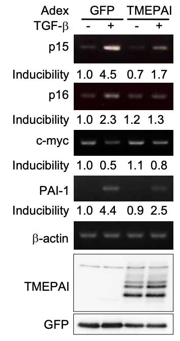 Figure S4. Ectopic Expression of TMEPAI Inhibits TGF-β-Induced Expression of p15, p16, and PAI-1 and Downregulation of c-myc Expression HaCaT cells infected with TMEPAI- or GFP-expressing adenoviruses were stimulated with 0.5 ng/ml TGF-β for 4 h before total RNAs were prepared. The expressions of TMEPAI and GFP in total lysates were detected with anti-V5 (6th panel) and anti-GFP monoclonal antibodies (SantaCruz) (bottom panel). The expressions of p15, p16, c-myc and PAI-1 were measured by semi-quantitative RT-PCR and normalized using the intensity of the band corresponding to β-actin. The level of induction was calculated relative to the value for GFP-infected cells in the absence of TGF-β |