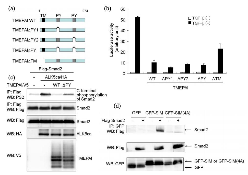 Figure S7. Contribution of PY Motifs and SIM Domain in TMEPAI for TGF-β Signaling (a) Schematic presentation of TMEPAI mutants lacking PY motifs or transmembrane domain. TM; transmembrane domain, PY; PY motif. (b) PY and TM motifs of TMEPAI are dispensable for its inhibitory effect on TGF-β-induced Smad dependent transcriptional response. TMEPAI and its mutants were co-transfected with (CAGA)12-luc in Mv1Lu cells with or without 5 ng/ml TGF-β for 18 h. (c) TMEPAIÎPY affects ALK5ca-induced Smad2 phosphorylation, albeit less efficiently than wild-type TMEPAI. COS7 cells were transfected with indicated plasmids. To show phosphorylation of Smad2 upon ALK5 activation, the cell lysates were immunoprecipitated with anti-Flag M5 antibody, and then analyzed by western blotting with PS2. (d) SIM domain is required for TMEPAI to bind to Smad2. COS7 cells were transfected with indicated plasmids. The cell lysates were immunoprecipitated with anti-GFP antibody (Wako), and then analyzed by western blotting with anti-Flag M5 antibody. For western blotting, anti-GFP antibody was used. GFP-SIM was constructed by introduction of the SIM in TMEPAI (Cys157 to Ile206) into pEGFP-C3. GFP-SIM(4A) was made by the introduction of four serious alanines instead of P178PNR181 as described in Fig. 3e. |
