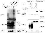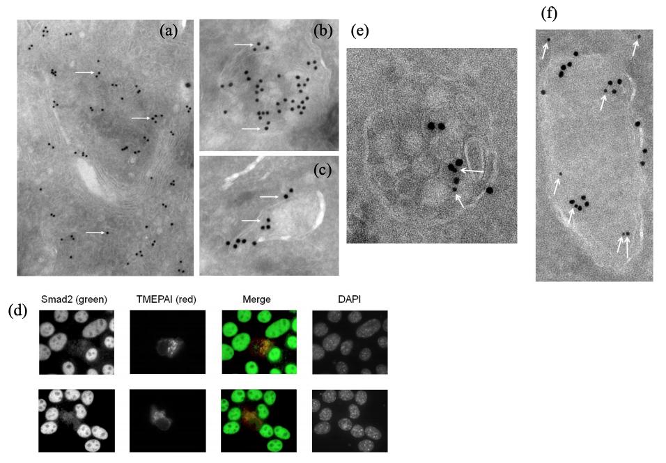 Figure S8. TMEPAI Is Mainly Localized in Golgi Apparatus and Endosomes (a-c) The subcellular distribution of TMEPAI was determined as follows: after MCF10A1 cells were transfected with TMEPAI/V5 for 40 h, cells were fixed with 2% paraformaldehyde and 0.2% glutaraldehyde in PHEM buffer (240 mM PIPES, 100 mM Hepes, 40 mM EGTA and 8 mM MgCl2 [pH6.9]) for 2 h at room temperature. After washing with PBS, the cells were pelleted and embedded in 12% gelatin. The pellet was cut into 1-mm3 cubes, cryoprotected in 2.3 M sucrose and snap-frozen in liquid nitrogen. Ultrathin cryosections were labeled with mouse anti-V5 monoclonal antibody (1:50 dilution), and indirectly labeled with 15 nm protein A-gold particles via a rabbit anti-mouse IgG bridging antibody (1:200 dilution). The grids were contrasted with uranyl acetate, embedded in methylcellulose and viewed with a Philips CM 10 transmission electron microscope. (a) Golgi apparatus. (b, c) Endosomes. Arrows indicate representative localization patterns of TMEPAI. (d-f) TMEPAI can co-localize with Smad2 in endosome-like structure. (d) NMuMG cells were transfected with TMEPAI/V5 and cultured for 24 h. After treatment of cells with 5 ng/ml TGF-β for 1 h, cells were fixed. Then, experiments were performed as described in Fig. 3i. Smad2 was translocated into nucleus upon TGF-β stimulation in cells lacking ectopic TMEPAI, whereas cells expressing TMEPAI showed partial co-localization between TMEPAI and Smad2. We hardly detected co-localization between TMEPAI and Smad2 without TGF-β stimulation. (e, f) 293T cells were transfected with TMEPAI/V5 and Flag-Smad2 and cultured for 40 h. Then, cells were treated according to Suppl. Fig. 8a-c. Ultrathin cryosections were labeled with mouse monoclonal anti-V5 antibody and indirectly labeled with 15 nm protein A-gold particles. After sections were fixed, they were incubated with rabbit monoclonal anti-Smad2 antibody (Cell Signaling), followed by incubation with 10 nm protein A-gold particles. The grids were contrasted with uranyl acetate, embedded in methylcellulose and viewed with a Philips CM 10 transmission electron microscope. Arrows indicate small dots corresponding to Smad2 in endosomes. We could also detect colocalization of TMEPAI with Smad2 in endosomes using the cryosections of intestinal polyps from APCMin/+ mice by an electron microscope (data not shown). |