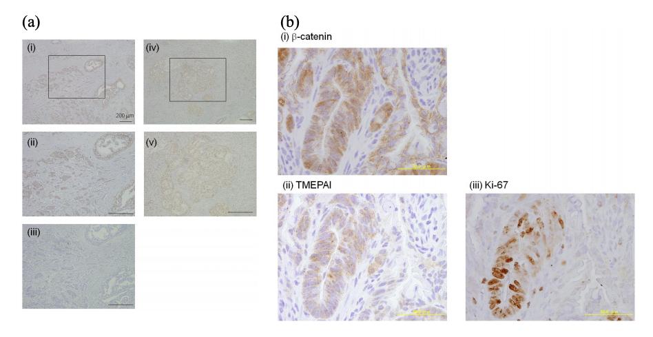 Figure S12. Expression of TMEPAI in Tumors (a) TMEPAI is highly expressed in tumor tissues from patients with breast cancer. The sections of formalin-fixed, paraffin-embedded mammary cancerous tissue from two patients [(i-iii) and (iv-v)] were exposed to mouse anti-TMEPAI monoclonal antibody. (ii and v) Higher magnitude in the square region of (i) or (iv). (iii) Anti-TMEPAI monoclonal antibody was added to the section after the antibody was absorbed with the peptide corresponding to a part of TMEPAI protein (Abnova). All sections were counterstained with hematoxylin. Two consecutive sections were used for (i) and (iii). (b) Paraffin-embedded sections of intestinal adenoma from ApcMin/+ mice. The paraffin-embedded mouse tissues were sectioned to a 3 μm thickness, deparaffinized in xylene, rehydrated in graded ethanol solution, and immersed in citrate-NaOH buffer (10 mM sodium citrate, pH 7.2) for 20 min at 115ËC to restore antigenicity. Then, the rehydrated sections were incubated overnight at 4ËC with mouse anti-TMEPAI monoclonal antibody (Abnova, 1:100), rabbit anti-Ki-67 antibody (Ylem S.R.L., 1:100), or mouse anti-β-catenin antibody (BD Transduction laboratories, 1:100). The sections incubated with the first antibodies were washed with PBS and subsequently colored using the Dako EnVision+system HRP (DAB) (DakoCytomation). Adenoma was stained for (i) β-catenin, (ii) TMEPAI and (iii) Ki-67 using 3 consecutive sections. All sections were counterstained with hematoxylin. |