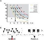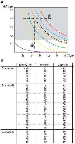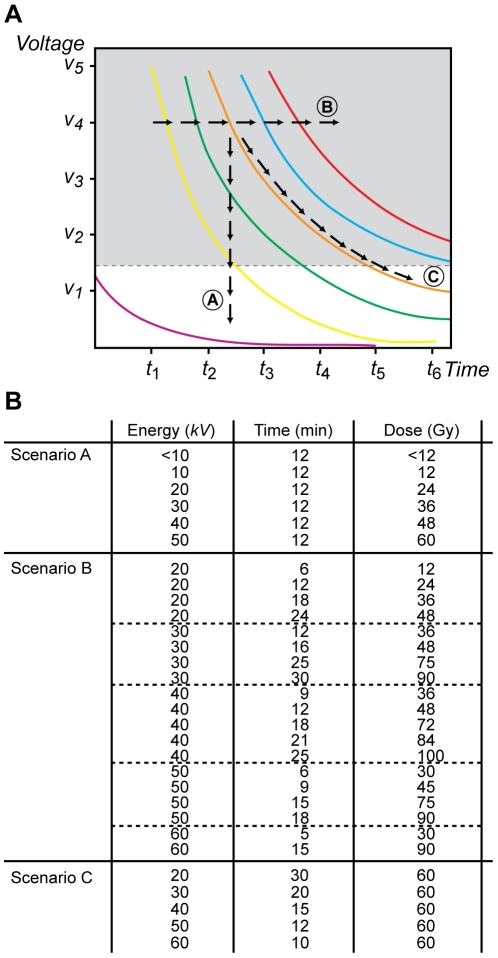 Figure 1. The energy-dependent hypothesis of apoptosis induction.A. Schematic representation of different paths in the space of control parameters (kV, T) used in our experiments. Here, we assumed that the energy of each photon (ε) generated by the X-ray source increases along with the voltage setting (kV) whereas its current (j) remains fixed. Thus, the total exposure (E) at which an embryo is subjected at any given time is proportional to kV x T. Three different scenarios are denoted and were tested: (Scenario A) E increases a as result of augmenting the energy of the photon ε and, therefore, kV while maintaining the exposure time (T) constant; (B) E increases by augmenting T while keeping a constant value for kV; and (C) E remains constant throughout all states analyzed as a result of increasing the exposure time (T) while diminishing kV accordingly. Each colored line represents a different total exposure, also named “dose”, E. The dotted line indicates a hypothetical threshold level below which there is not an observable effect of radiation in a biological system. B. Summary of the experimental conditions to be analyzed in order to evaluate the scenarios discussed above. |