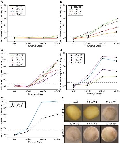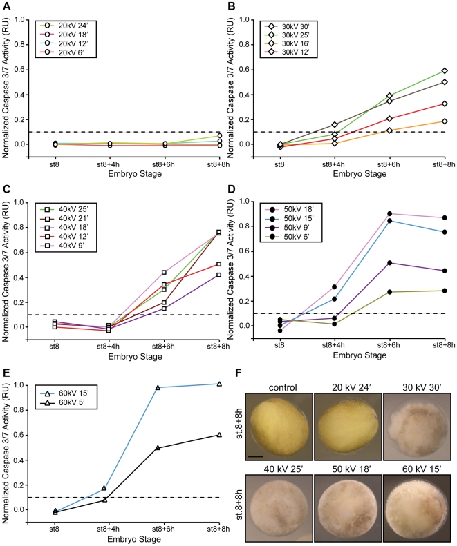 Figure 3. A minimum energy value is required to trigger apoptosis.Embryos were irradiated (γ-IR) or not (control) before the MBT (st.6) with either 20 kV (A), 30 kV (B), 40 kV (C), 50 kV (D) or 60 kV (E) of energy for the indicated times, collected at st.8 (MBT) and 4, 6 and 8 h after the MBT, and frozen. Samples equivalent to ten embryos were tested for caspases 3/7 activity using a specific colorimetric substrate as described in the “Materials and Methods” section and normalized as described in the legend of Fig. 2. Points indicate the average of ten embryos at each time stage. Results similar to those presented here were observed in three independent experiments. F. Morphology of Xenopus embryos not irradiated (control) or irradiated with 20, 30, 40, 50 kV for 24, 30, 25, 18, 15 min, respectively, and collected 8 h after the MBT. Scale bar, 250 µm. |