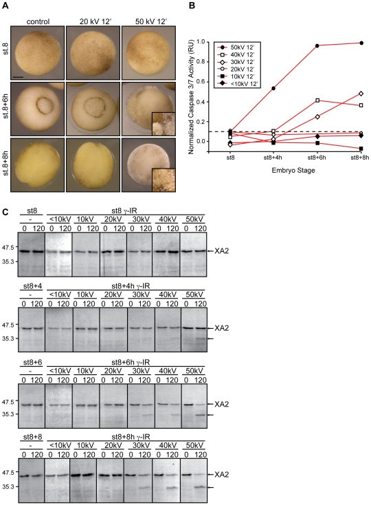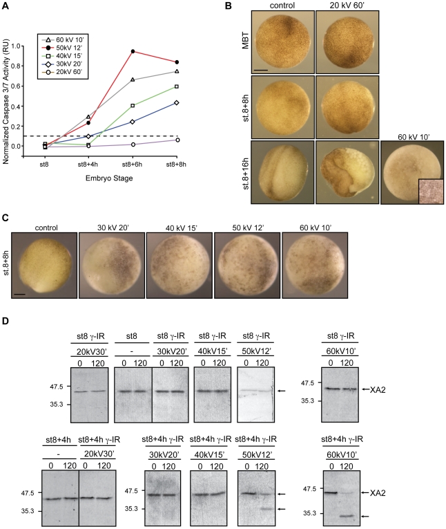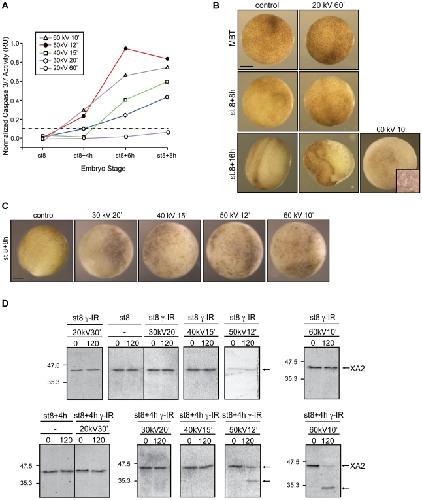 Figure 5. Xenopus embryos exhibit different biological responses to the same dose of radiation.A. Embryos irradiated (γ-IR) or not (control) before the MBT were collected at the indicated energies and times as summarized in Fig. S2.C. Caspase activity was assayed as described in the legend of Figure 2. Points indicate the average of ten embryos at each time stage. Figure shows data from a single experiment that was repeated three times with similar results. B. Morphology of Xenopus embryos non-irradiated (control) or irradiated with 20 kV for 60 min and collected at MBT (st.8), st.8+8 h and st.8+16 h. For comparison, an embryo treated with 60 kV for 10 min and collected at st.8+16 h is displayed. Inset shows a higher magnification image of typical apoptotic morphology from a similar embryo. C. Morphology of Xenopus embryos non-irradiated (control) or irradiated with 30, 40, 50, 60 kV for 20, 15, 12 and 10 min, respectively, and collected 8 h after the MBT. Scale bar, 250 µm. D. Caspases 3/7 activity were also assessed by cleavage of the radiolabeled cyclin A2 in extracts from control (non-irradiated) or γ-IR with the same total dose as indicated. Arrows on the right denote radiolabeled Xenopus cyclin A2 (XA2) and its cleaved form. |