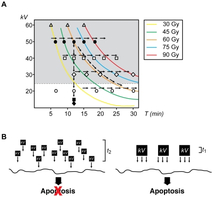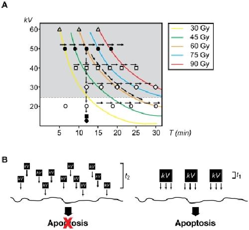 Figure 7. The energy-dependent model of the apoptotic response.A. Summary of all experimental conditions analyzed in this work. Arrows indicate each of the three scenarios tested. Energy was measured in kilovolts (kV) and exposure time (T) in min. Colored lines indicate the same total exposure dose. Symbols indicate various energies tested: ⧫: <10 kV, ▪: 10 kV, ○: 20 kV, ◊: 30 kV, □: 40 kV, •: 50 kV, △: 60 kV. B. Conceptual model for the contribution of energy and exposure time to the induction of apoptosis. Energy (kV) is delivered to the sample in either small (left) or large (right) quantum packages. In our schematic representation, small packages are ¼ the size of the large ones, whereas the exposure time is four times longer (t2 = 4t1) in the model represented on the left, and thus, the total exposure dose is the same in both settings. In our model, apoptosis is exclusively induced when large packages of energy are delivered to the sample even when the total exposure dose is the same in both scenarios. |