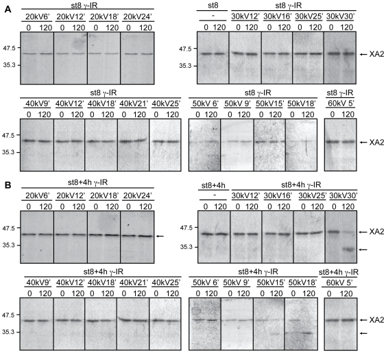 Figure 4. High-dose radiation raises caspase activity and favors cyclin A2 cleavage.Extracts equivalent to ten embryos from non-irradiated (control) or irradiated (γ-IR) samples collected at MBT (st.8, A) and 4 h after the MBT (B) were incubated with radiolabeled cyclin A2 as described in the “Materials and Methods” section. Aliquots were removed at the indicated times and analyzed for cyclin A2 cleavage by SDS-PAGE and autoradiography. Control samples correspond to non-irradiated embryos. Arrows on the right denote radiolabeled Xenopus cyclin A2 (XA2) and its cleaved form. |