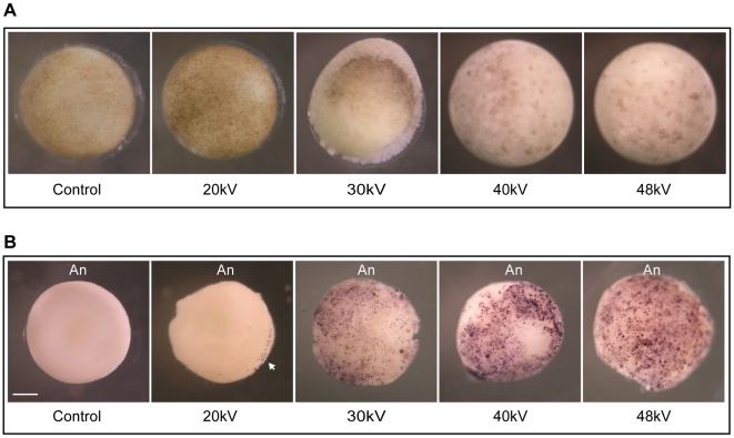 Figure 6. Whole-mount TUNEL assay exposes apoptotic cells in irradiated embryos.A. Pre-MBT embryos were exposed to different energies 20 kV, 30 kV, 40 kV and 48 kV to equal a total dose of ∼65 Gy. Non-irradiated embryos are referred to as “control”. Six hours after the MBT, embryos were fixed in MEMFA as described in the “Materials and Methods” section and photographed. B. TUNEL staining was performed on fixed embryos to detect DNA fragmentation. Embryos were treated as described in (A). Intense TUNEL staining was detected in the animal pole portion of the embryos. The embryos shown in B are representative of the TUNEL staining observed following analysis of ∼80 embryos of which 20% were stained. Arrowhead points to labeled nuclei. An, animal pole. Scale bar, 250 µm. |