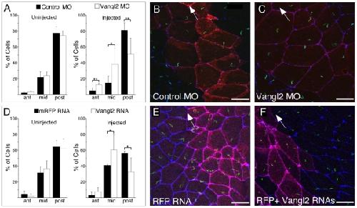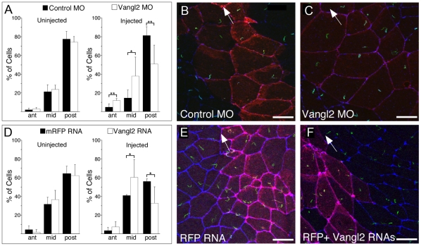 Figure 4. Vangl2 Morpholino or RNA alters positioning of cilia in the GRP.(A, D) A clone of cells in the GRP was generated by injecting one dorsal blastomere of 8-cell stage embryos with Vangl2 MO or a Vangl2 RNA, along with RFP RNA as a tracer or as a control. At stages 17/18, the dorsal half of the embryo was removed, fixed, and stained with antibodies directed to ZO-1 and acetylated–tubulin to mark cell boundaries and cilia, respectively. GRP cilia both inside (injected) and outside (uninjected) the clone were scored based on the location in GRP cells that were divided into three equal zones (anterior, middle and posterior). Shown are data from a minimum of 3 GRPs where 100–200 injected and uninjected cells were scored. Asterisks (* = p<0.05, ** = p<0.01.) represent p-values obtained using a two-tailed t-test. (B–C, E–F) Shown are confocal images of the GRP injected with the Vangl2 MO and RFP RNA (C), with Control MO and RFP RNA (B), with Vangl2 and RFP RNAs (F) or with RFP RNA alone (E). RFP (red) marks the position of the injected clone, cilia (green) are stained with the acetylated-tubulin antibody, and cell boundaries (blue) are stained with an antibody to ZO-1. Anterior is indicated by direction of the arrow in B, C, E, F.
