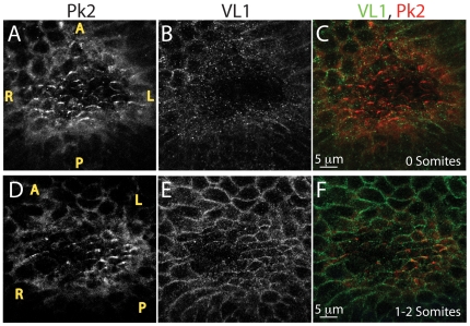 Figure 1. VANGL1 and PRICKLE2 set up PCP in the mouse ventral node.(A–F) Localization of VL1 and PK2 proteins in the ventral node: PRICKLE2 is expressed in the node of 0 somite embryos (A, C red) prior to VANGL1, which is detected in node cells (E, F, green) of 1–2 somite embryos. VL1 and PK2 co-localize in node cells and form crescents pointed toward the anterior (F, yellow). Motile cilia can be visualized above the plane of VL1 or PK2 localization (not shown). Yellow letters mark anterior (A), posterior (P), Left (L) and right (R). As nodes were imaged from the ventral side, left side of the embryo is on the right side of each panel and right side of the embryo is on the left side of each panel.