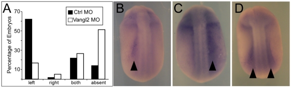 Figure 5. Vangl2 MO knockdown disrupts left-right patterning.(A) Xenopus embryos were injected with Vangl2 MO, or Control MO alone, targeting one dorsal blastomere at the 8-cell stage to generate a clone of injected cells within the GRP. At stages 20/21, embryos were fixed and probed by in-situ hybridization with an antisense Xenopus nodal-related1 (Xnr1) probe. Sidedness of staining was scored for at least 60 embryos for each condition. Data from one experiment are shown. (B–D) Shown are embryos injected with either Vangl2 or Control MOs and then probed with Xnr1 in-situ probe. Xnr1 staining is evident on the left (B) right (C) or both (D) sides of the midline. Black arrowheads indicate staining.