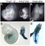 Figure 2. Vangl1gt/gt homozygous embryos fail to turn.Vangl1+/gt heterozygous embryos are normal and they develop into viable, fertile adults. In contrast, ∼14% of Vangl1gt/gt mutants die at E9.5–10.5. (A', B') Cranial (A') and dorsal (B') views of Vangl1gt/gt mutant embryos shown in A and B showing open neural tube defects. (B, B') One mutant and its heterozygous littermate were stained for VANGL1-βGEO fusion protein. Each of five phenotypically mutant Vangl1gt/gt homozygotes isolated at this stage failed to turn from lordotic to fetal position.