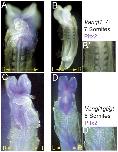 Figure 3. Aberrant Pitx2 expression in a Vangl1gt/gt homozygous embryo.(A, B) Wild-type embryos with 7 somites (A, B, B') have Pitx2 expressed in the left lateral plate mesoderm (LPM). (C, D) A Vangl1gt/gt homozygous embryo with 8 somites has Pitx2 expressed bilaterally but predominant expression is in the right LPM. (D') Somites of the Vangl1gt/gt homozygous mutant are narrow and compressed in the anterior-posterior direction, in comparison to the wild-type embryo (B'). The mis-expression of Pitx2 and the turning defect suggest that Vangl1 might regulate L-R asymmetry establishment in the mouse ventral node. (B') and (D') are the boxed regions from (B) and (D) and are at the same magnification.