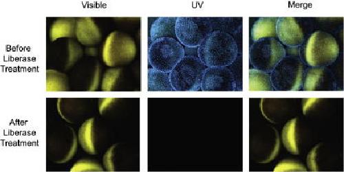 Fig. 1. Chemical defolliculation of oocytes completely removes the oocyte follicular cells, illustrated here by Hoechst (UV) staining of follicular cell nuclei, before and after Liberase treatment.